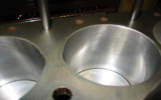After fitting the studs, the top of the block is cleaned of grease and dirt and examined carefully for lifted threads round the studs ( if found then remove the stud and lightly countersink the hole) - note also that the bores are clean and you can see the 60 degree crosshatch of the honing clearly in this shot, you can also just see the cutout in the top of the bore for the exhaust valve...... |