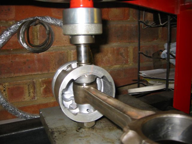 | Here the gudgeon pin is being pressed into place - note the support ring below - the press shows a healthy 3 tons of pressure required to push the gudgeon pin into the con rod small end. | |