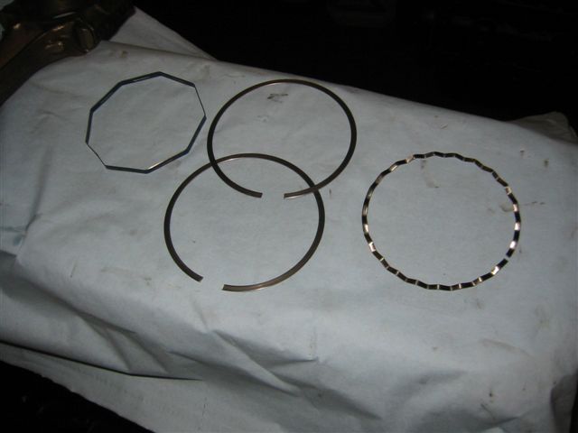 | Components of the oil control ring - the octagonal expander ring, the wavy separator ring and the two thin scraper rings. | |