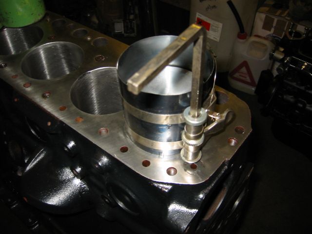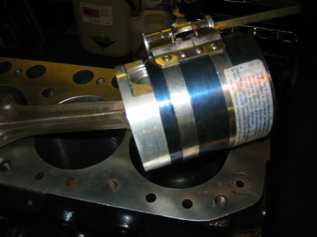 | Fit the big end shells to the con rods and their caps, check the running clearance and coat the shells with Graphogen. Oil the piston - especially the ring grooves, and fit the ring compressor like this..... | |