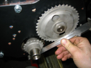 | The sprockets are checked for alignment by placing a straight edge across them like this and shims added or removed from behind the crank sprocket as necessary - in this case a five thou shim is removed. | |