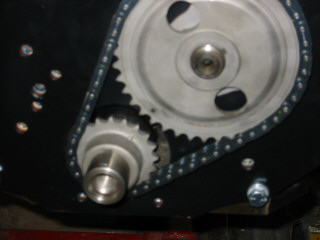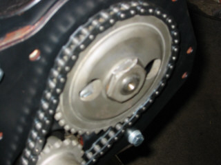 | The chain is fitted to the sprockets and the marks aligned - a dot on the cam sprocket and a pip on the crank one - the cam is now "degreed" or timed - see separate section here | |