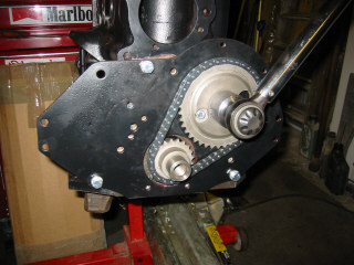 | After degreeing the cam, fit the camshaft locktab and nut and torque up to 60 ft lbs - you can just see an old club hammer head holding the crank from rotating! | |
