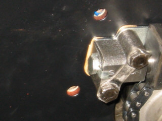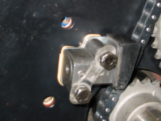 | Slip the end of the plate behind the chain and bolt up the tensioner - ensure the pad is free to move in and out, overtightening the bolts can cause it to bind.... | |