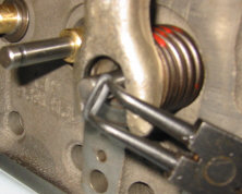 | The first job is to lap the valves into the seats using a very fine paste - Peter laps the seats in before I get them but I like to make sure there is a perfect seal and this also marks the width of the seat onto the valve ...... | |