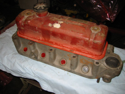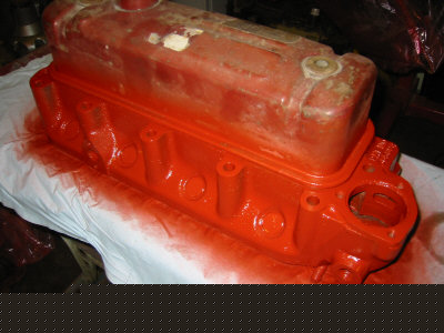 | Once all the valves are in, its painting time - note the pennies in the spark plug recesses and the old valve cover to act as a mask..... | |